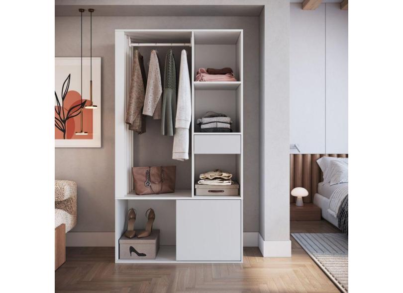 O menor preço encontrado no Brasil para Guarda-roupa Closet com 1 Gaveta 1 Cabideiro 2 Prateleiras e 1 Porta Cl100 Branco atualmente é R$ 586,65.