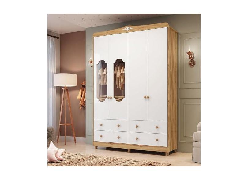 Guarda-roupa de Bebê 156,80cm 4 Portas com Janela 4 Gavetas 100% Mdf Maya Provençal Espresso Móveis Branco Brilho/Amêndoa