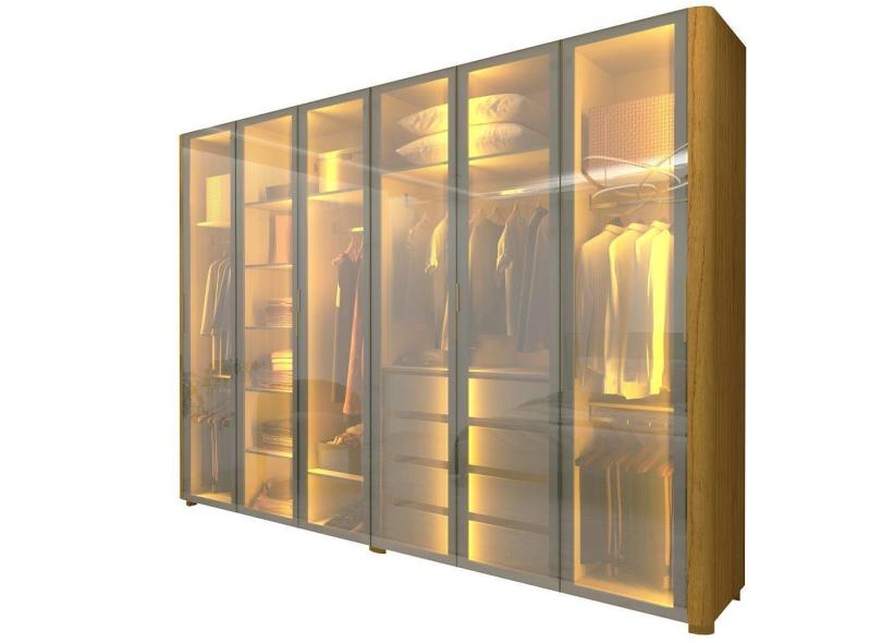 Guarda Roupa de Casal Gelius Innova com 250 cm de Largura 6 portas com 6 portas de vidro reflecta 4 gavetas com pés e LED Naturale