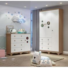 Guarda Roupa e Cômoda Moveis Peroba Bolinha 03 portas MDF Branco carva
