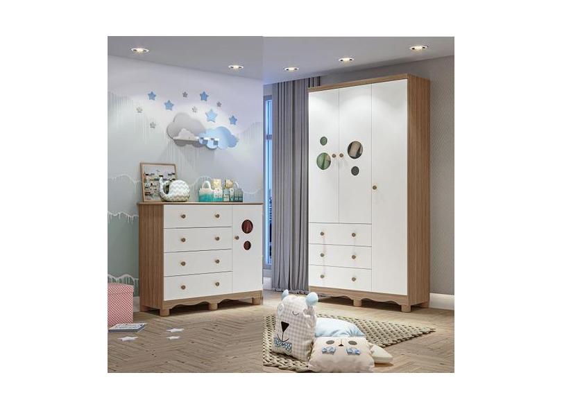 Guarda Roupa e Cômoda Moveis Peroba Bolinha 03 portas MDF Branco carva