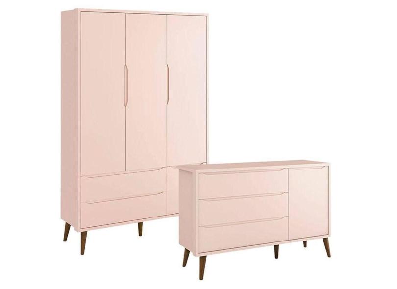 Guarda Roupa Infantil 3 Portas E Cômoda Theo 1 Porta Rosa Com Pés Amadeirados - Reller
