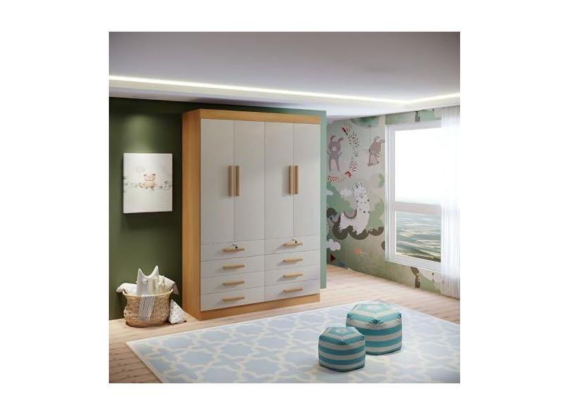 Guarda-Roupa Infantil 4 Portas Frente MDF Puxador de Madeira Aquarela Cinamomo/Off White