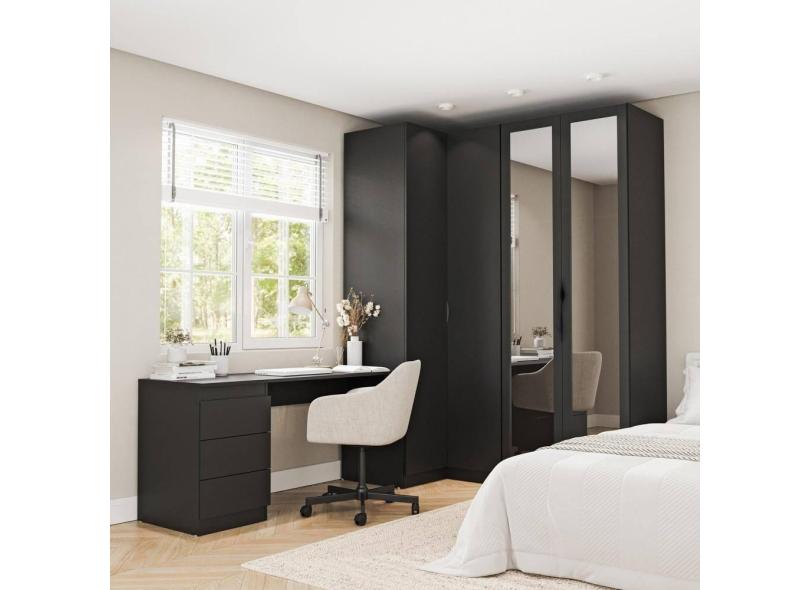 Guarda Roupa Modulado de Canto 3 Peças 4 Portas com 2 Portas Reflecta e Escrivaninha Hera CabeCasa MadeiraMadeira Preto
