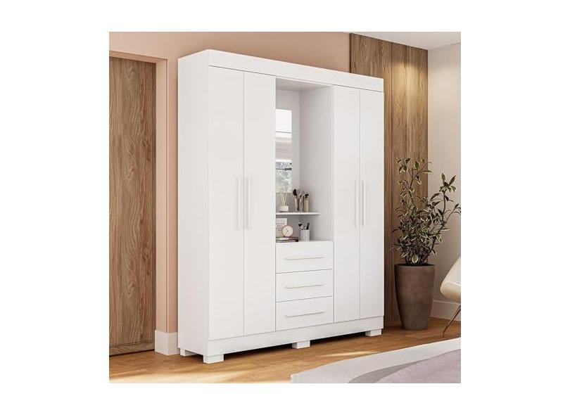 Guarda-roupa Solteiro 164,10cm 4 Portas 3 Gavetas Capelinha com Espelho 100% Mdp Gardênia Branco