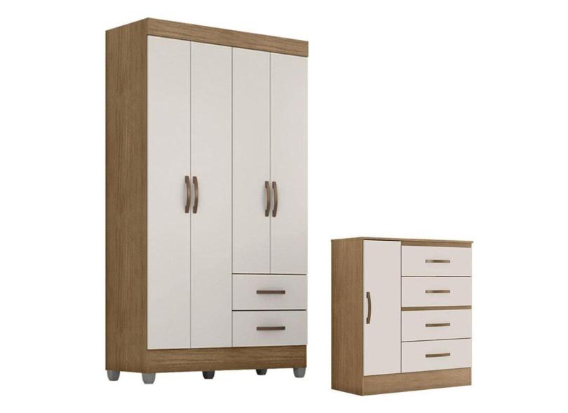 Guarda Roupa Solteiro 4 Portas e Cômoda 4 Gavetas e 1 Porta Lite Nature Off White - Móveis Leão