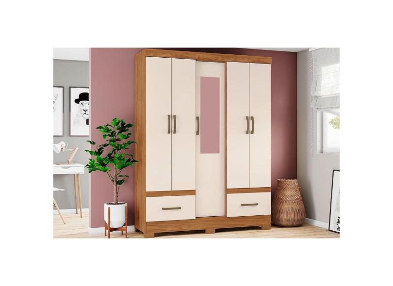 Guarda Roupa Solteiro 5 Portas E 2 Gavetas C/ Espelho E Pés Briz B60 Nature/Off White - Henn