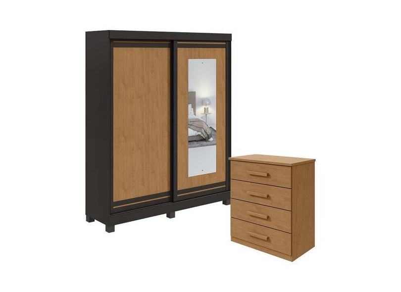 Guarda Roupa Solteiro Lani Com Espelho E Pés Cômoda Baião Preto Amêndo