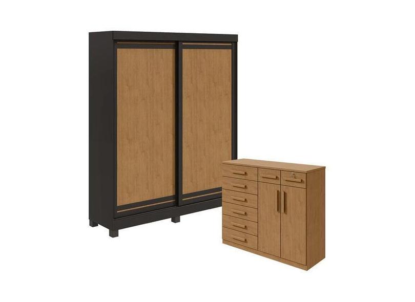 Guarda Roupa Solteiro Lani Com Pés E Cômoda Toronto Preto Amêndoa Clea