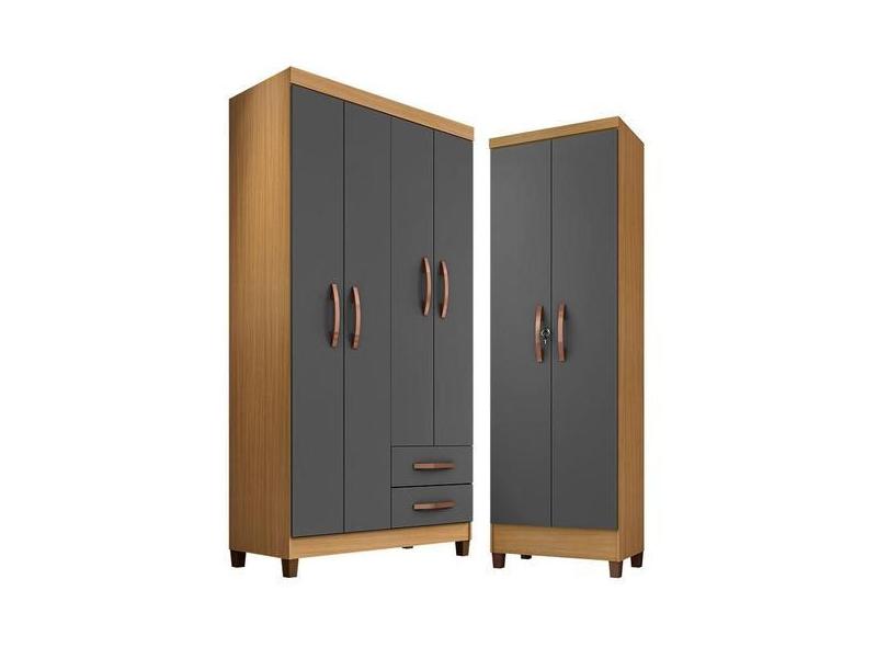 Guarda Roupa Solteiro Modena 4 Portas e Armário Multiuso Egito Carvalh