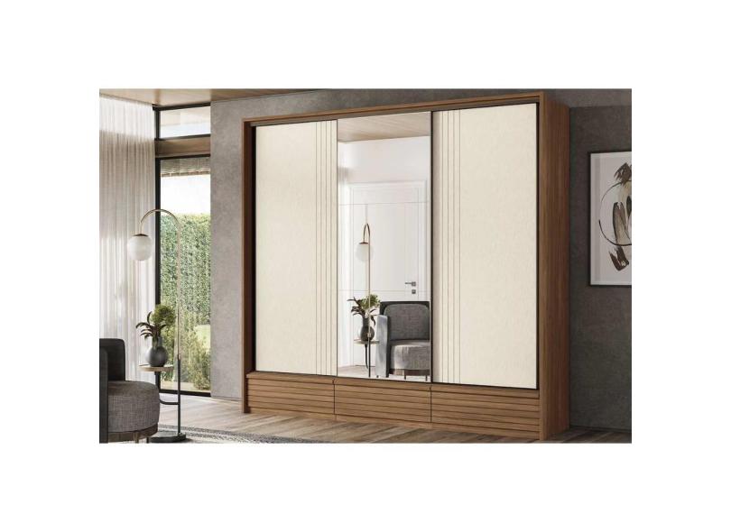 Guarda Roupas 3 Portas de Correr de (1 c/ Espelho) e 5 Gavetas Democrata Jatobá/Areia - Santos Andirá