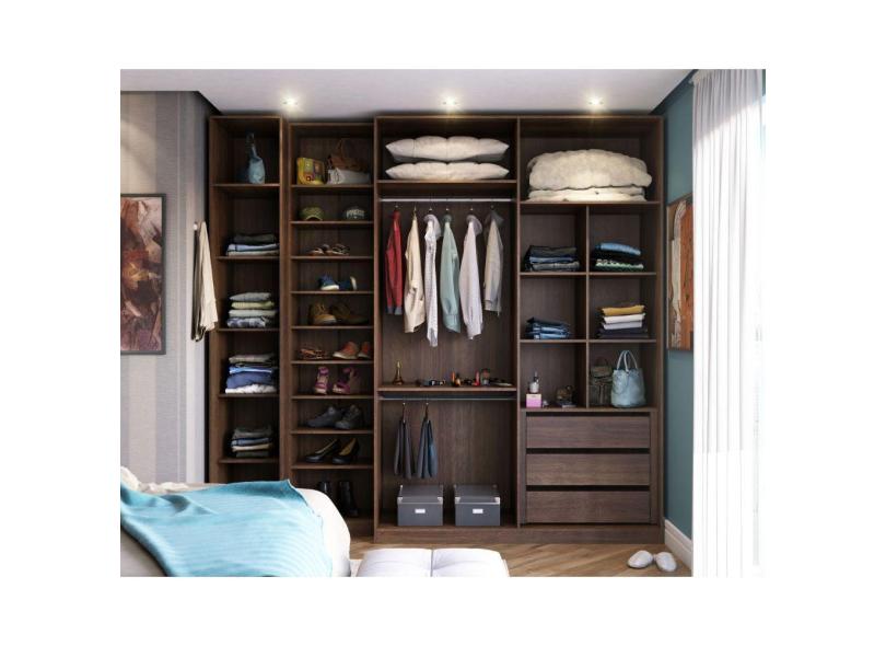 Guarda Roupas Closet Aberto 3 Módulos Com 3 Gavetas 2 Cabideiros Prime Nogueira Dourado