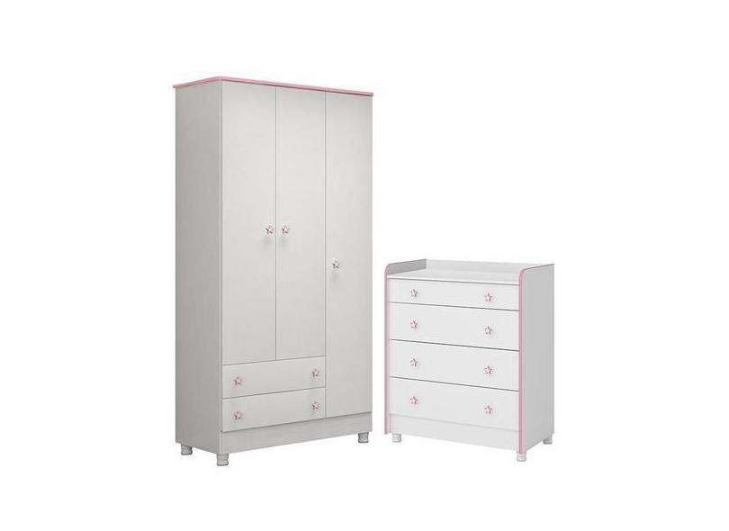Jogo De Quarto Doce Sonho Guarda Roupa 3 Portas E Cômoda Trocador Rosa