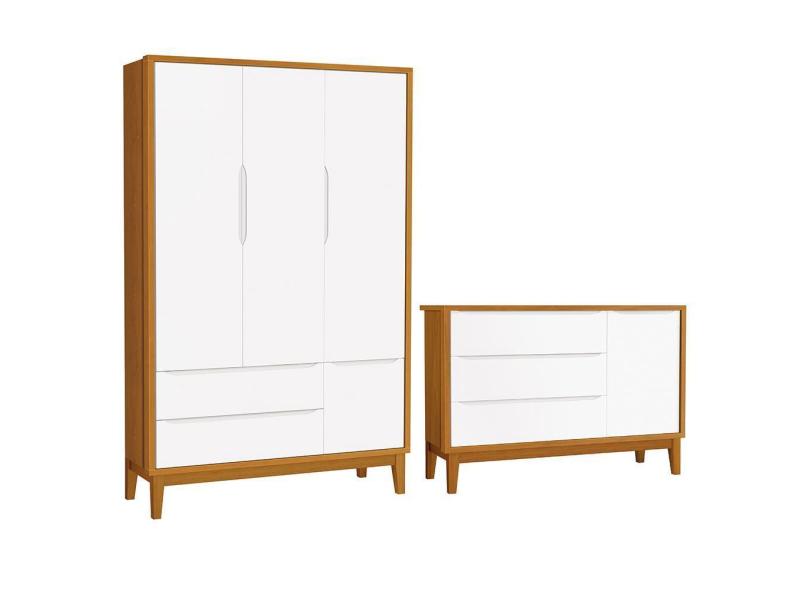Jogo de Quarto Infantil Guarda Roupa 3 Portas e Cômoda 1 Porta Classic com Pés Amadeirado - Reller Móveis Branco/Savana
