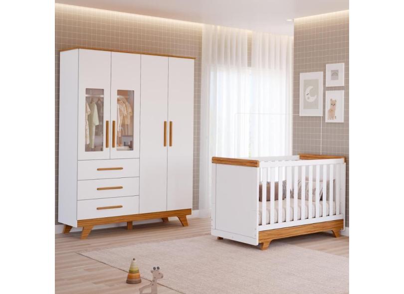 Quarto Bebê Retrô Janelado Completo Berço Americano 2 Em 1 Guarda Roupa 4 Portas 3 Gavetas 100% MDF Móveis Peroba