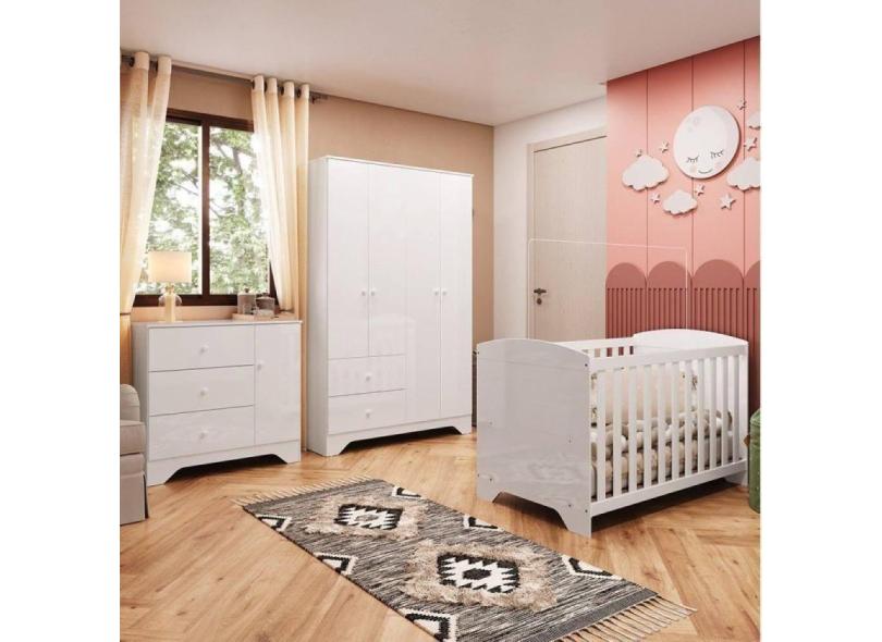 Quarto de Bebê com Berço Americano Guarda Roupa e Cômoda 100% MDF Ayla Branco Brilho