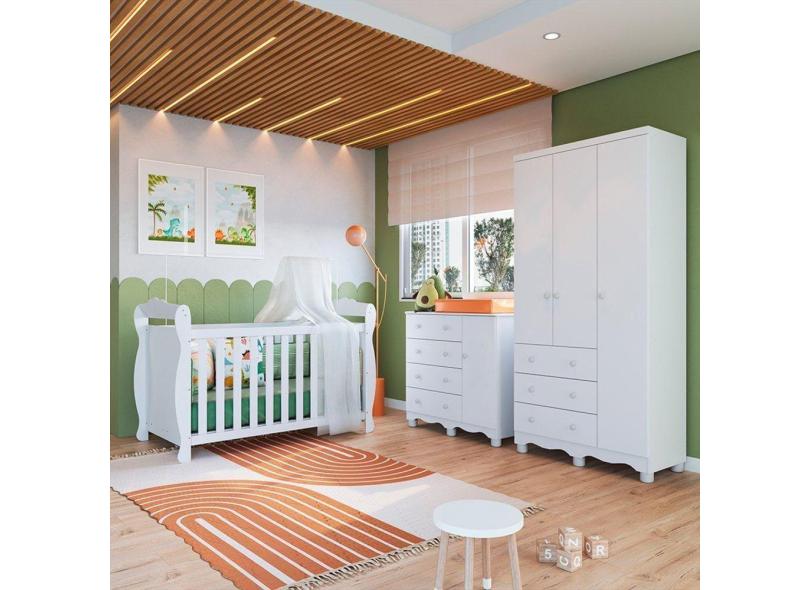 Quarto de Bebê com Guarda Roupa 3 Portas Cômoda 1 Porta 4 Gavetas e Berço Nina 100% Mdf Espresso Móv Branco Brilho