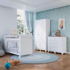 Quarto de Bebê com Guarda Roupa 3 Portas Cômoda 1 Porta e Berço Americano Nina Espresso Móveis Branco Brilho