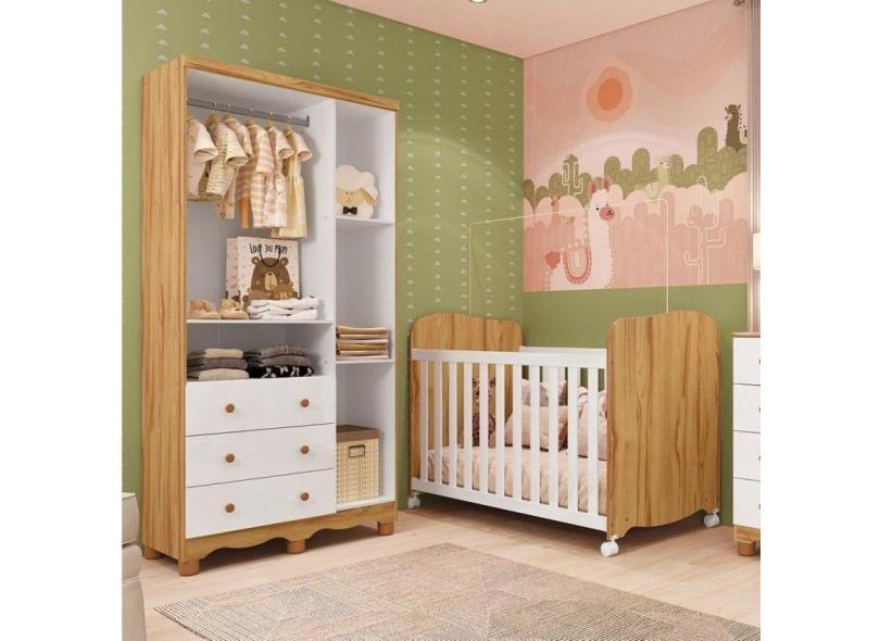 Quarto de Bebê com Guarda Roupas 3 Portas 3 Gavetas e Berço Espresso Móveis Branco Brilho/Amêndoa