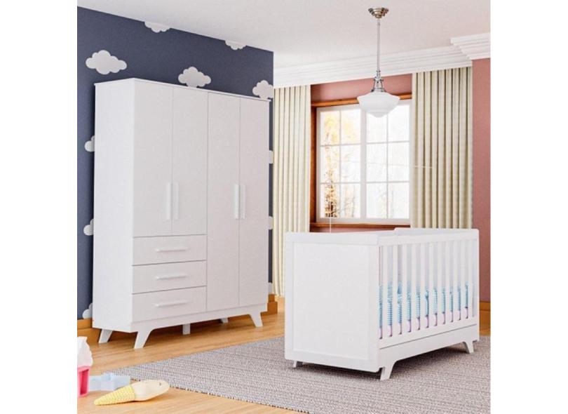 Quarto de Bebê Completo Berço Retrô com Guarda Roupa 4 Portas 3 Gavetas Móveis Peroba Branco Brilho