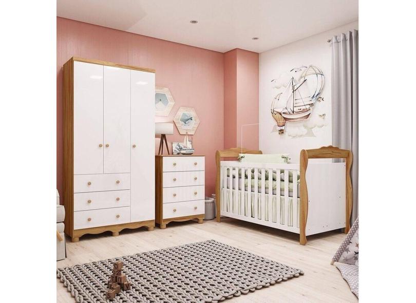 Quarto de Bebê Completo com Guarda-roupa 3 Portas e Cômoda e Berço Nina 100% Mdf Espresso Móveis Branco Brilho/Amêndoa