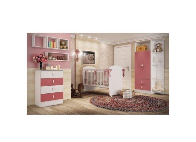 Quarto de Bebê Fofura, com Guarda Roupa, Comoda e Berço Móveis Percasa Branco/Rosa