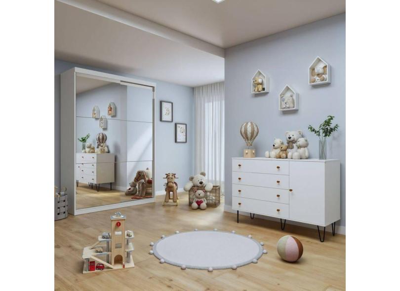 Quarto Infantil Guarda-Roupa 2 Portas Espelhadas Lumi com Cômoda 1 Porta 4 Gavetas Aurora Branco