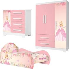 Quarto Infantil Princesa Com Cama, Comoda, Guarda Roupa Rosa
