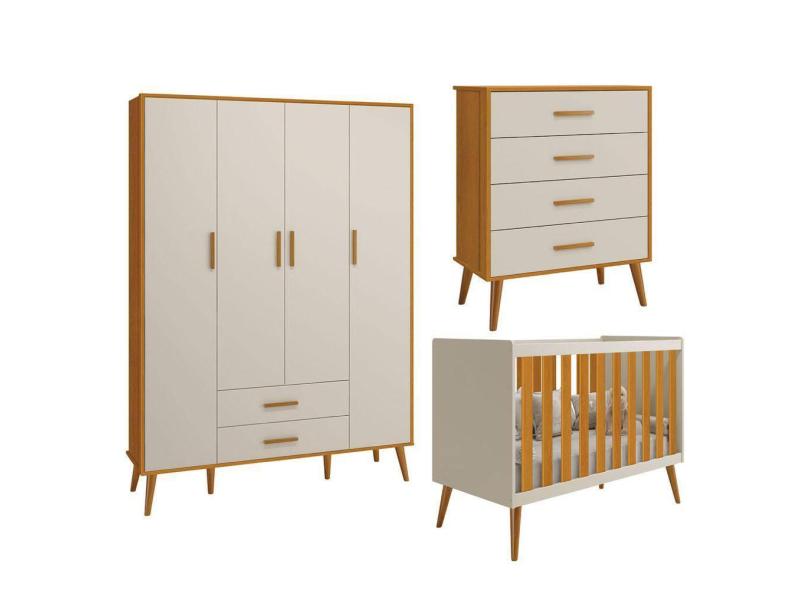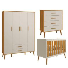 Quarto Isis Berço Americano 2 em 1 + Comoda Gaveteiro + Guarda Roupa Isis Retrô 4 Portas 2 Gavetas Areia Fosco/ Savana Fosco - Reller