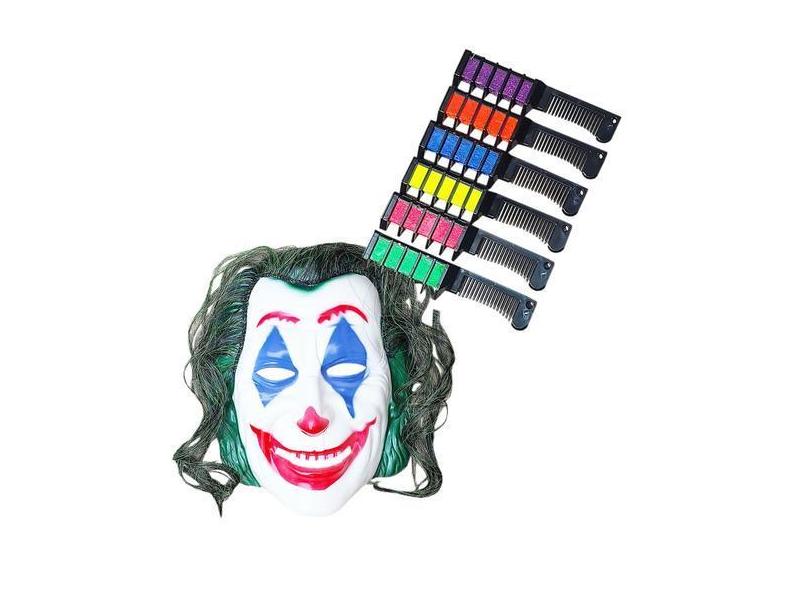 Máscara Plástica Coringa com Cabelo + Giz Tintura Temporária 6 Cores S