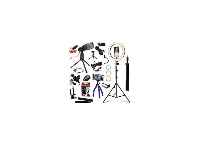 Kit Iluminador De Led Ring light Tripé 2 metros + Microfone Condensador Acessórios Filmagem Celular