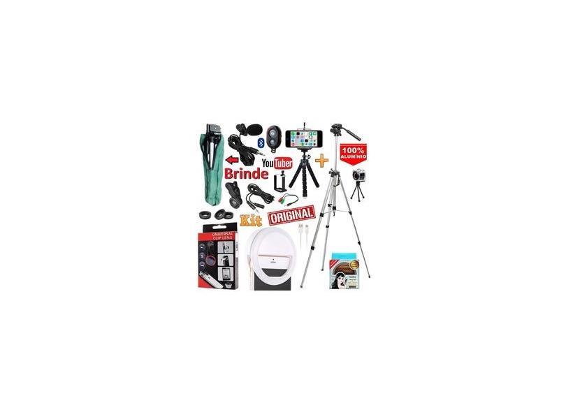 Kit Youtuber Profissional Tripé 1,30m + Microfone Lapela Celular Smartphone Iphone Android Universal + Luz Led Mini Ring Light Kit Lentes Olho Peixe Controle Bluetooth Foto Vídeo