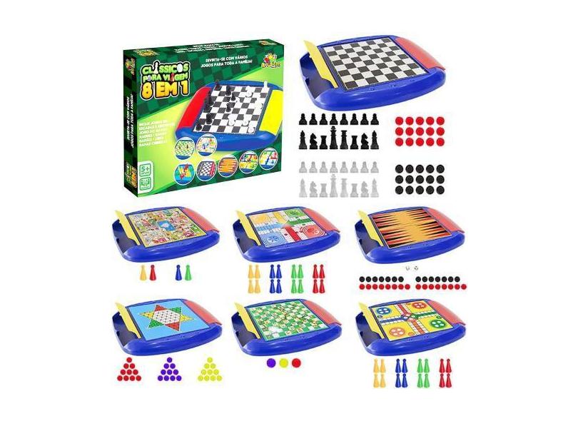 Kit Tabuleiro com 8 jogos em 1 Dama Xadrez Gamão Ludo Art brink
