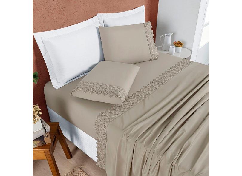 Jogo Cama Lençol Bouclê Solteiro Micro Percal 200 Fios c/ Laise Bordada 3 Peças - Bege Taupe
