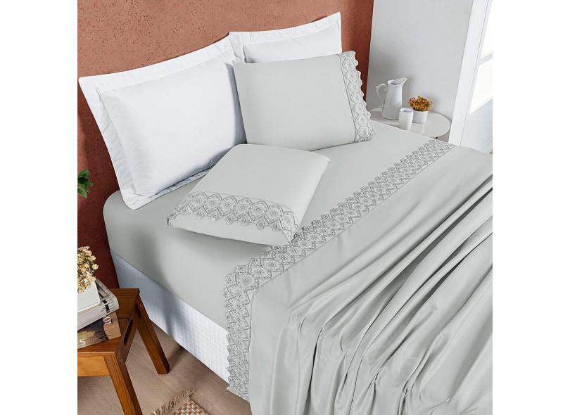 Jogo Cama Lençol Bouclê Solteiro Micro Percal 200 Fios c/ Laise Bordada 3 Peças - Cinza Geada