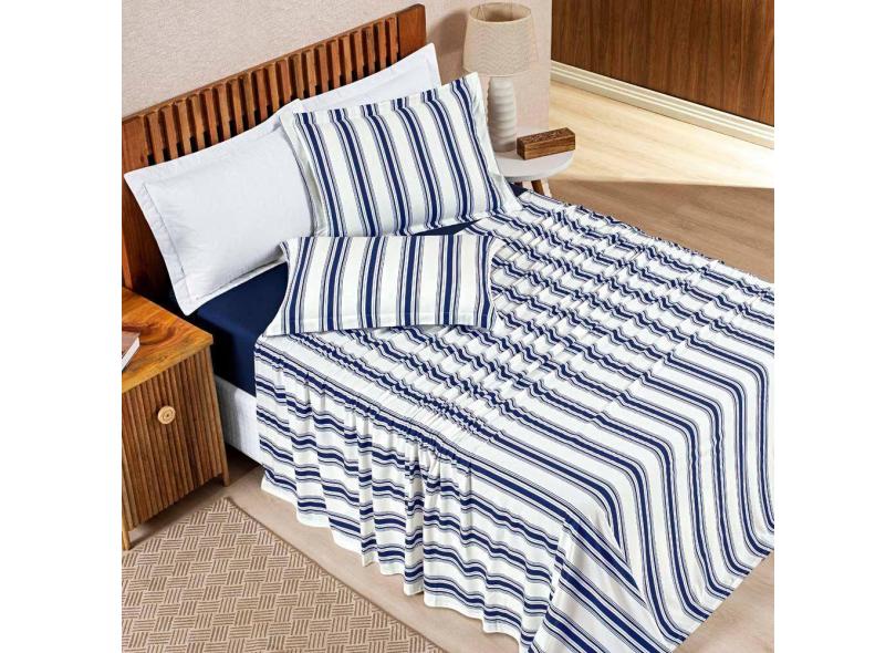 Jogo Cama Lençol Daily Casal Padrão Malha 100% Algodão Listrado 4 Peças - Azul Marinho