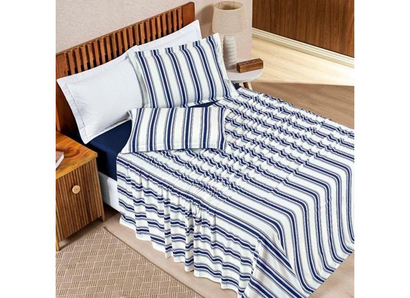 Jogo Cama Lençol Daily Queen Malha 100% Algodão Listrado 4 Peças - Azul Marinho