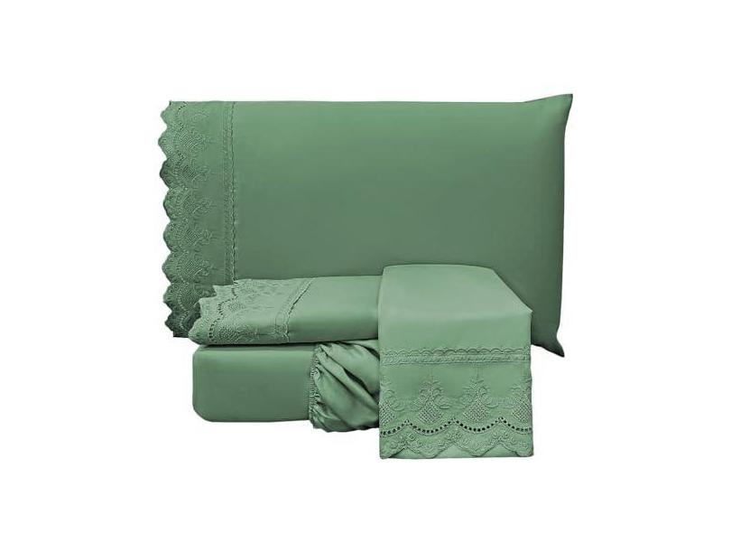 Jogo Cama Lençol Loren Queen Bordado Inglês Micro Percal 300 Fios 4 Peças - Verde Esmeralda