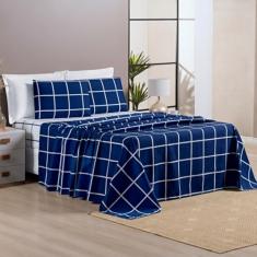 Jogo De Cama Casal Dupla Face Grid Micro Percal 200 Fios Austin 4 Pçs Marinho