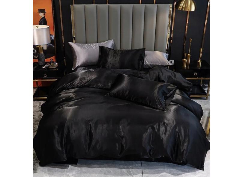Jogo De Cama Casal King Cetim 7 Pç Completo Preto Com Prata