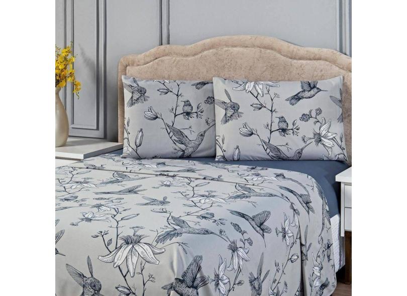 Jogo De Cama Lençol Beija-flor Azul-cinza Solteiro 03 Peças Estampado Percal 300 Fios Acetinado