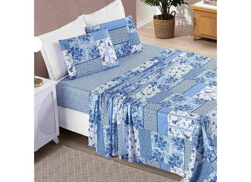 Jogo De Cama Lençol Casal Padrão 04 Peças Microfibra Estampada Ayla - Azul Sereno