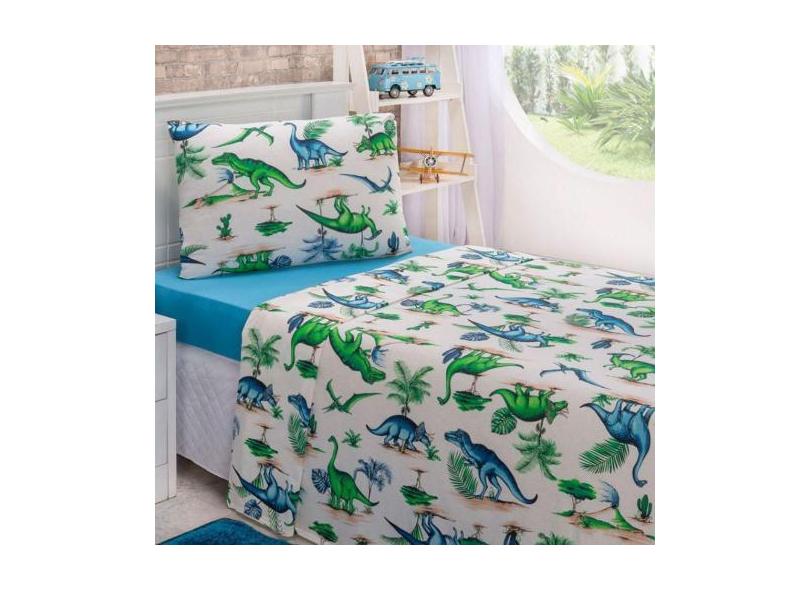 Jogo De Cama Lençol Em Malha Solteiro Dinossauro 3 Pç Verde - Top Chic