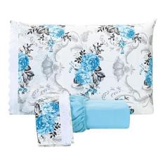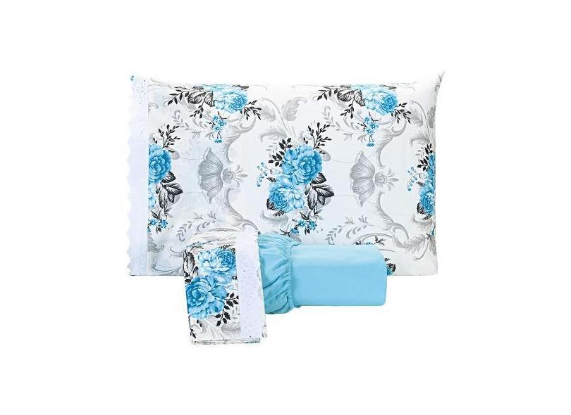 Jogo De Lençol Estampado Casal King 03 Peças Flores Azul Claro (Piscin