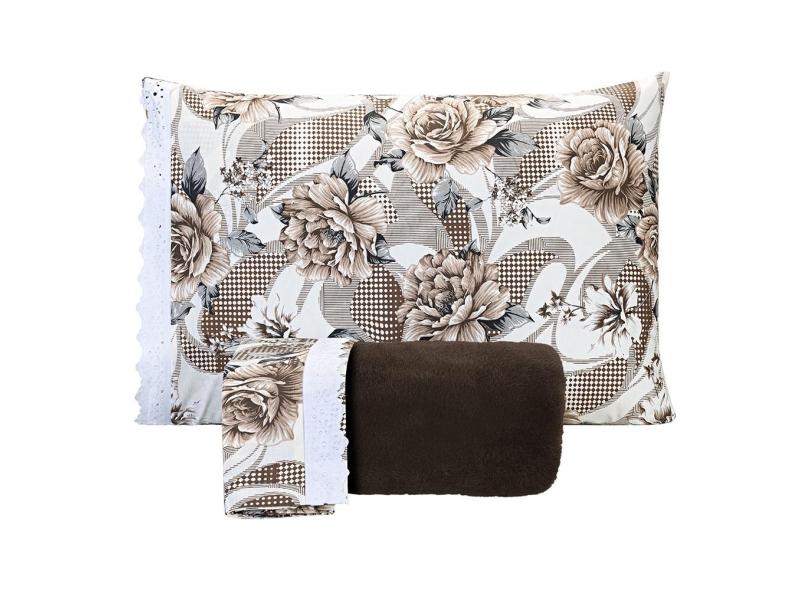 Jogo de Lençol King Manta Soft com Elástico 3 Peças- Flores Marrom