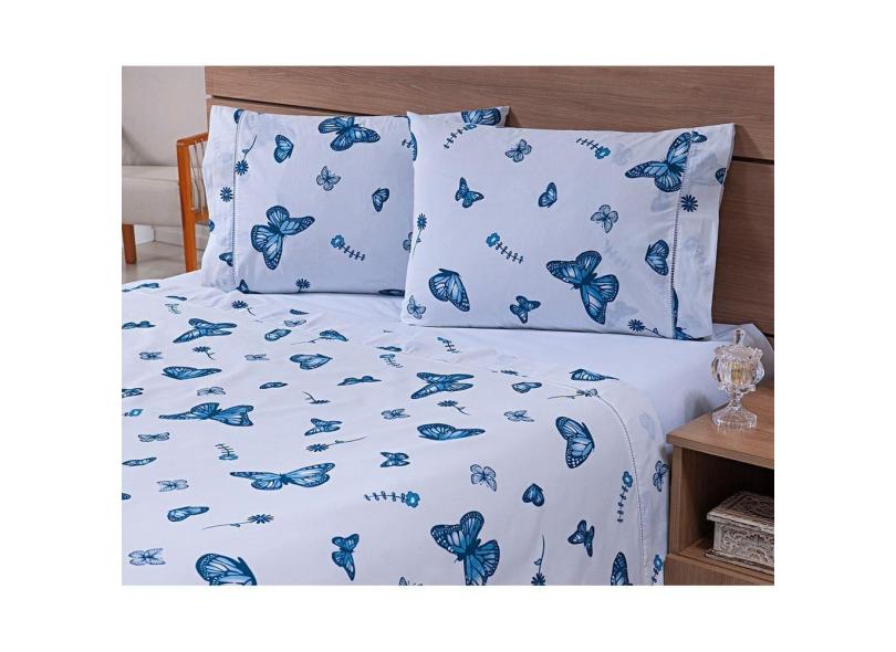 Jogo Lençol 4 Peças Cama Viúva 2,03mx1,20mx30cm 100% Algodão 180 Fios Ponto Palito Borboletas Azul