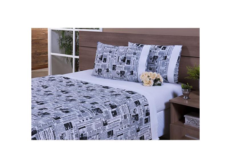 Jogo Lençol 4 Peças Cama Viúva Percal 150 Fios Estampa de jornal barrado branco