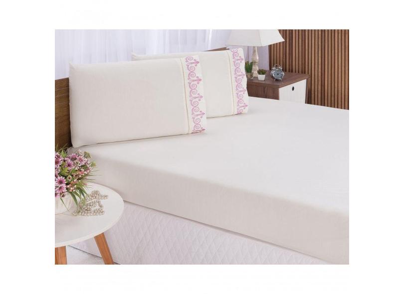 Jogo Lençol Quarto Casal Padrão Bordado 3 Pç Palha Com Rose