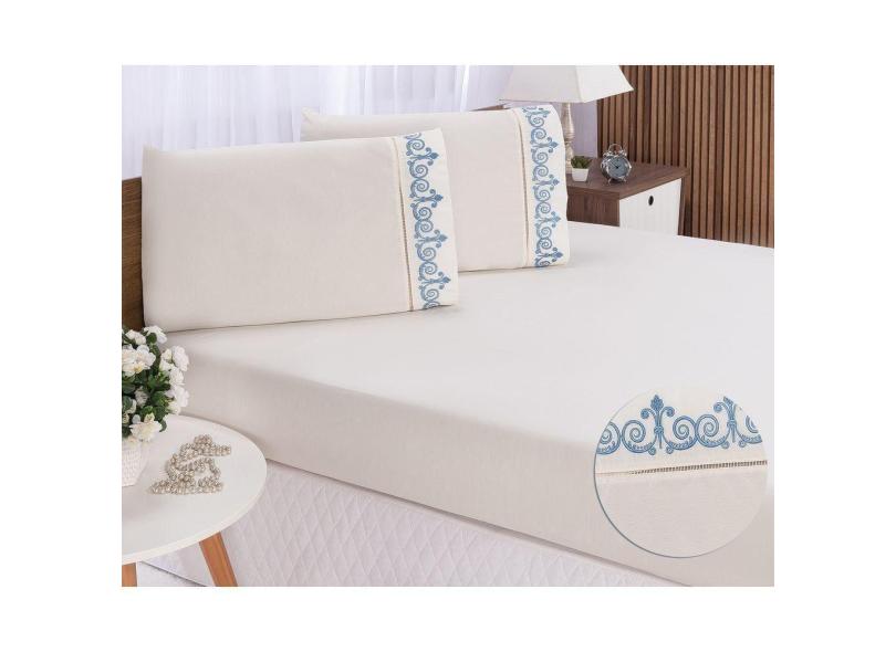 Jogo lençol quarto casal Padrão bordado 3pç Palha com Azul