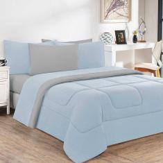 Kit Edredom + Jogo De Lençol Malha 100% Algodão Gran Moratta 6 Peças Casal - Azul Bebê-cinza
